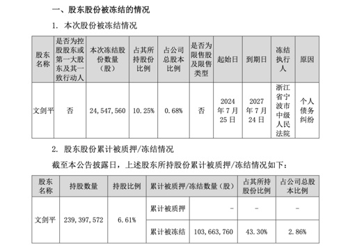 7月25日,文剑平持有的2454.76万股股份被浙江省宁波市中级人民法院冻结,原因为个人债务纠纷。截至目前,文剑平累计被冻结的股份数量达1.04亿股,占公司总股本比例为2.86%。