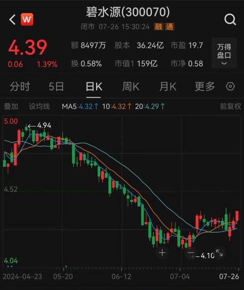 截至7月26日收盘,碧水源每股报4.39元,上涨1.39%,公司最新市值为159亿元。