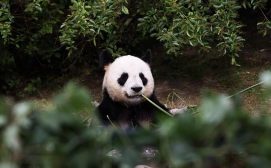 7月8日,旅法大熊猫“圆仔”在奥运圣火传递前吃竹子。新华社记者 高静 摄