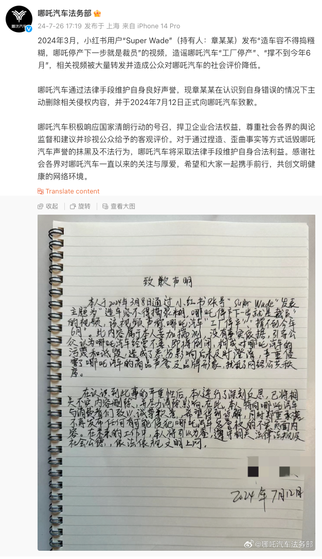 7月26日,哪吒汽车法务部发布声明称,2024年3月,小红书用户“SuperWade”(持有人:章某某)发布“造车容不得捣糨糊,哪吒停产下一步就是裁员”的视频,造谣哪吒汽车“工厂停产”、“撑不到今年6月”,相关视频被大量转发并造成公众对哪吒汽车的社会评价降低。哪吒汽车通过法律手段维护自身良好声誉,现章某某在认识到自身错误的情况下主动删除相关侵权内容,并于2024年7月12日正式向哪吒汽车致歉。