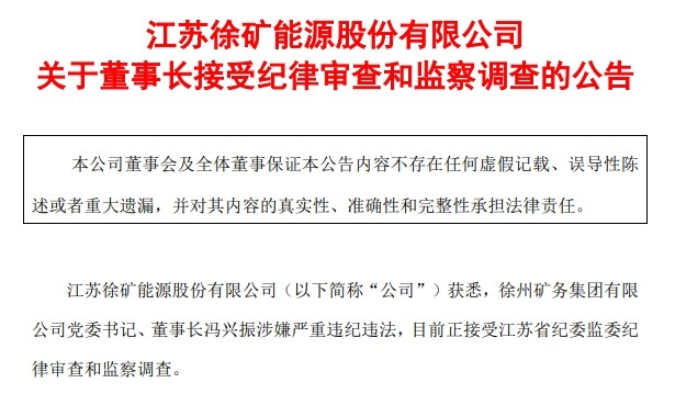7月25日,苏能股份(600925.SH)发布公告称,公司获悉,徐州矿务集团有限公司(简称“徐矿集团”)党委书记、董事长冯兴振涉嫌严重违纪违法,目前正接受江苏省纪委监委纪律审查和监察调查。