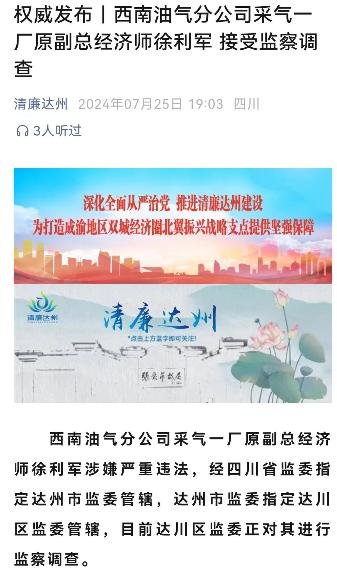 7月25日,据“清廉达州”微信公众号消息,西南油气分公司采气一厂原副总经济师徐利军涉嫌严重违法,经四川省监委指定达州市监委管辖,达州市监委指定达川区监委管辖,目前达川区监委正对其进行监察调查。