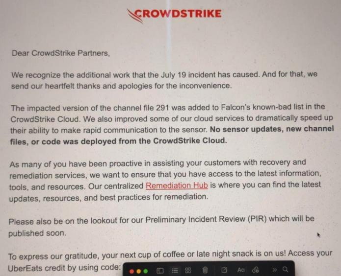 根据诸多科技媒体以及社交媒体的网友爆料,CrowdStrike本周向全球合作伙伴送上了一张10美元的道歉礼品卡,可以在外卖平台Uber Eats上使用。