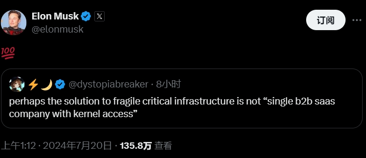 除了发泄怒气外,马斯克也频频转贴,引导网友们展开更多思考——单单一家软件公司的失误,就能令全球这么多国家的信息基础设施陷入瘫痪,这种市场份额集聚的状态是不是有问题?