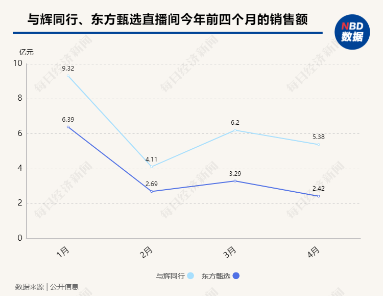 飞瓜数据显示,今年前四个月,“与辉同行”的直播间销售额分别为9.32亿元、4.11亿元、6.2亿元和5.38亿元;东方甄选直播间同期销售额分别为6.39亿元、2.69亿元、3.29亿元和2.42亿元。