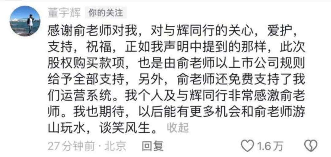 董宇辉还回应称:“感谢俞老师对我,对与辉同行的关心,爱护支持,祝福,正如我声明中提到的那样,此次股权购买款项,也是由俞老师以上市公司规则给予全部支持,另外,俞老师还免费支持了我们运营系统。我个人及与辉同行非常感激俞老师。我也期待,以后能有更多机会和俞老师游山玩水,谈笑风生。”