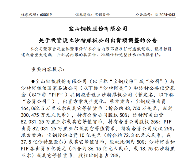 2023年4月7日,公司第八届董事会第二十八次会议审议通过了《关于参股沙特厚板公司及担保事项的议案》,同意宝钢股份与沙特阿美和PIF共同投资设立沙特厚板公司。原方案为:宝钢股份出资16.41亿里亚尔或其它等值货币(折合约4.38亿美元,或约30.05亿元人民币),持有合资公司股权50%;沙特阿美出资8.20亿里亚尔或其它等值货币,持有合资公司股权25%;PIF出资8.20亿里亚尔或其它等值货币,持有合资公司股权25%。