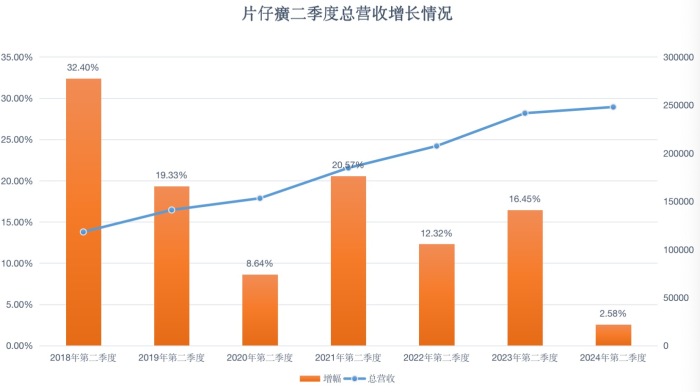 其二,最更为致命的是,片仔癀收获近五年内最差二季度营收增幅。2024年二季度,片仔癀实现营收24.8亿元,增幅首次降至个位数,为2.58%。此次增幅也还远低于于受新冠大流行影响最深的2020年。