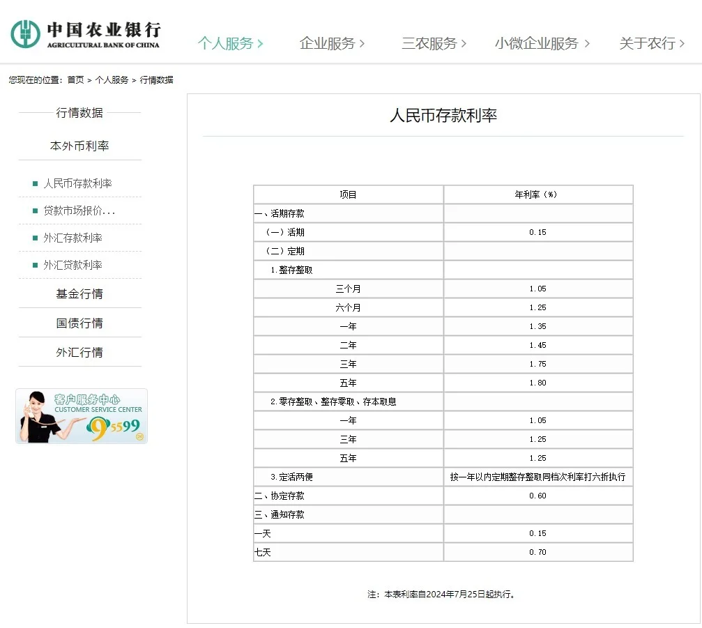 7月25日,农业银行官网显示,该行同样全面下调存款利率。其中,三个月、六个月、一年期整存整取定存利率均下调10个基点,下调至1.05%、1.25%、1.35%。二年期、三年期、五年期利率分别下调20个基点,下调至1.45%、1.75%、1.80%。