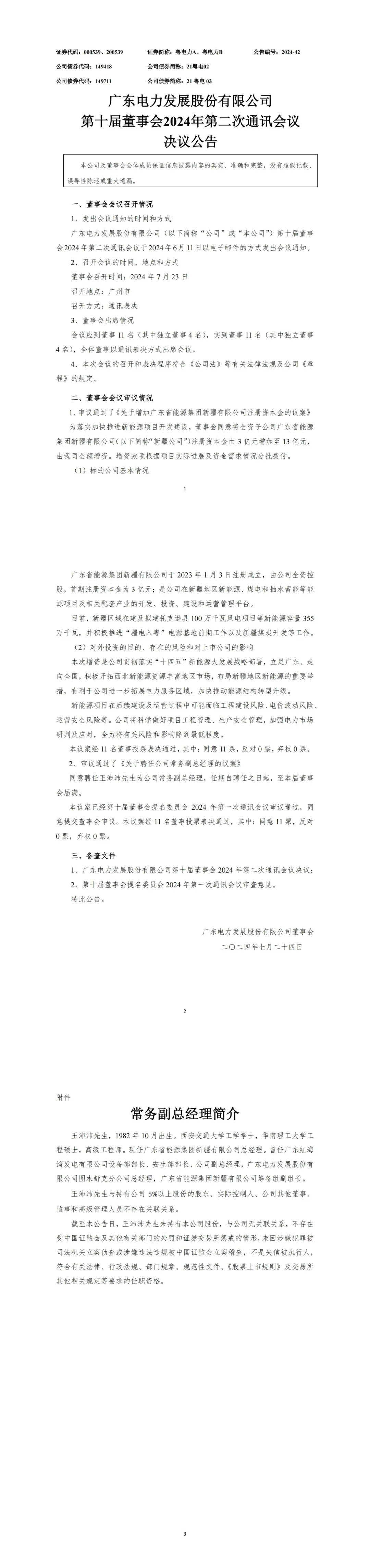 7月23日,粤电力A公告,董事会审议通过了《关于聘任公司常务副总经理的议案》,同意聘任王沛沛先生为公司常务副总经理,任期自聘任之日起,至本届董事会届满。