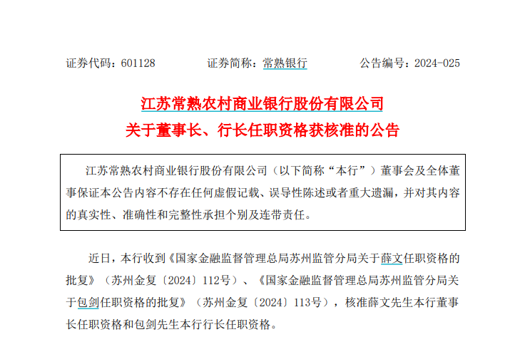 7月23日,常熟银行发布公告称,近日,本行收到《国家金融监督管理总局苏州监管分局关于薛文任职资格的批复》《国家金融监督管理总局苏州监管分局关于包剑任职资格的批复》,核准薛文本行董事长任职资格和包剑本行行长任职资格。