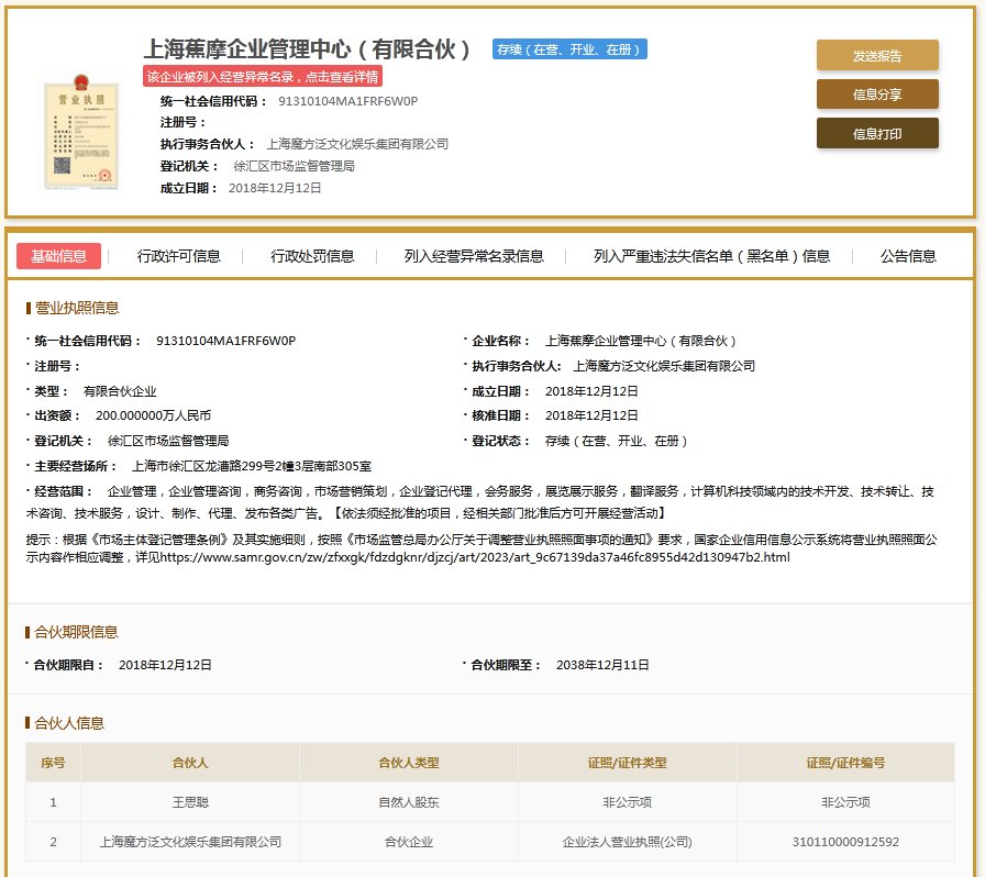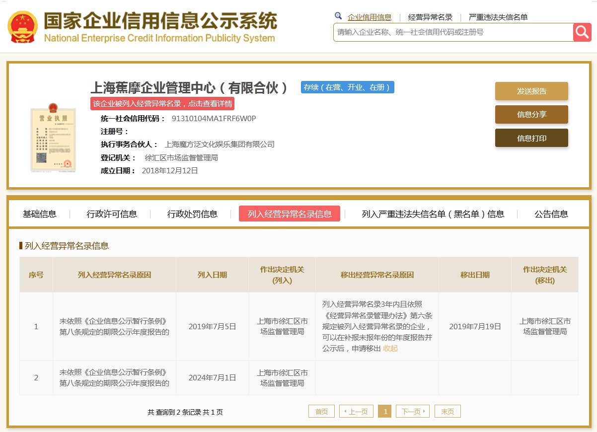 国家企业信用信息公示系统显示,因未依照《企业信息公示暂行条例》第八条规定的期限公示年度报告,上海蕉摩企业管理中心(有限合伙)被列经营异常名录。