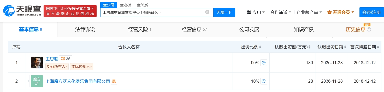 国家企业信用信息公示系统披露的合伙人信息显示,合伙人包括王思聪、上海魔方泛文化娱乐集团有限公司。