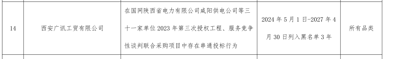 其中,西安广讯工贸有限公司在国网陕西省电力有限公司咸阳供电公司等三十一家单位2023年第三次授权工程、服务竞争性谈判联合采购项目中存在串通投标行为。处理措施:2024年5月1日-2027年4月30日列入黑名单3年。处理范围:所有品类。