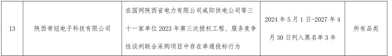其中,陕西帝冠电子科技有限公司在国网陕西省电力有限公司咸阳供电公司等三十一家单位2023年第三次授权工程、服务竞争性谈判联合采购项目中存在串通投标行为。处理措施:2024年5月1日-2027年4月30日列入黑名单3年。处理范围:所有品类。