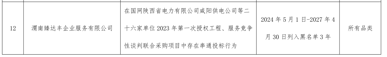 其中,渭南臻达丰企业服务有限公司在国网陕西省电力有限公司咸阳供电公司等二十六家单位2023年第一次授权工程、服务竞争性谈判联合采购项目中存在串通投标行为。处理措施:2024年5月1日-2027年4月30日列入黑名单3年。处理范围:所有品类。