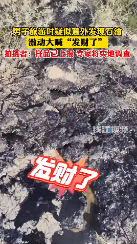 7月20日,新疆阿勒泰一男子旅游时疑似意外发现石油,激动大喊“发财了”,还用手指头摸了一下,有拉丝的感觉。