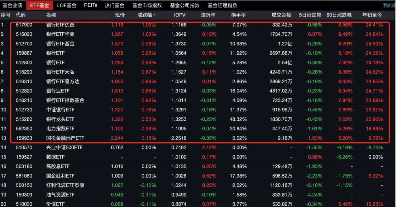 随着ETF的扩容,宽基、行业指数覆盖度足够反应出市场的行情,以今天为例,场内共有780只股票型ETF,赚钱的合计13只,也就是以下这些,清一色的银行。YYDS(银行、运营商、电力和石油煤炭)的高股息仅剩一个Y了。