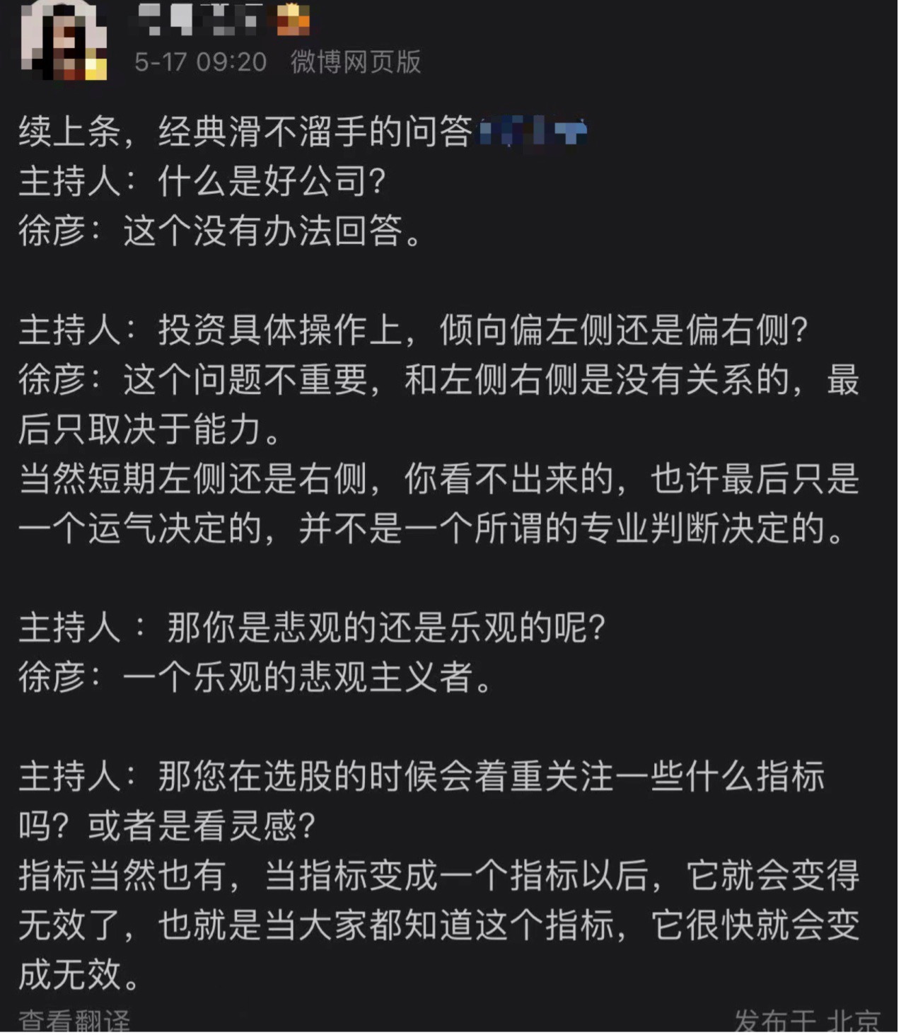 除了季报小作文,徐彦此前还被称为“滑不留手”的采访对象。在某次专访中,主持人问他,什么是好公司?他说:这个没有办法回答。主持人又问他:操作上是偏左侧还是右侧?他说:这不重要。再问选股指标,他的回答是:当然有指标,但是当指标变成指标时就无效了。
