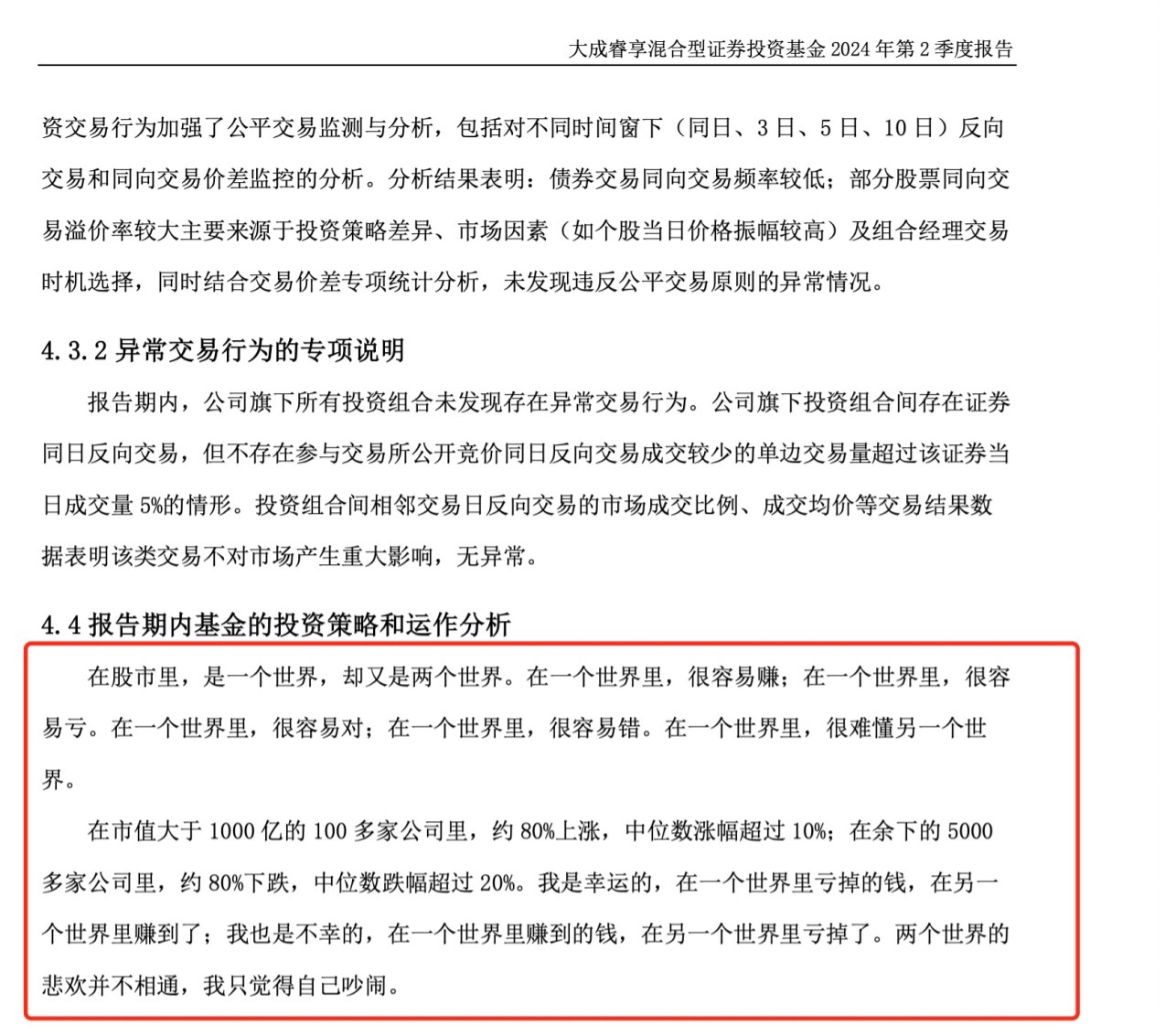 从年初的“百年孤独”风到二季报的“两个世界”论,徐彦的分享字数少了大半,今年只有两段,从人类的悲喜并不相通而来,发散出在市场中赚钱与不赚钱两种截然不同的心态。