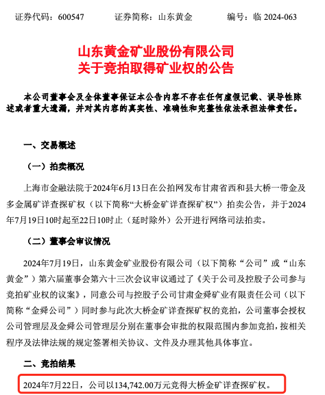 G4968号是谁?7月23日晚间公告显示,山东黄金竞得大桥金矿详查探矿权。