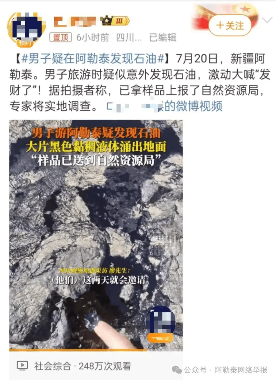 7月20日,新疆阿勒泰一男子旅游时疑似意外发现石油,激动大喊“发财了”,还用手指头摸了一下,有拉丝的感觉。