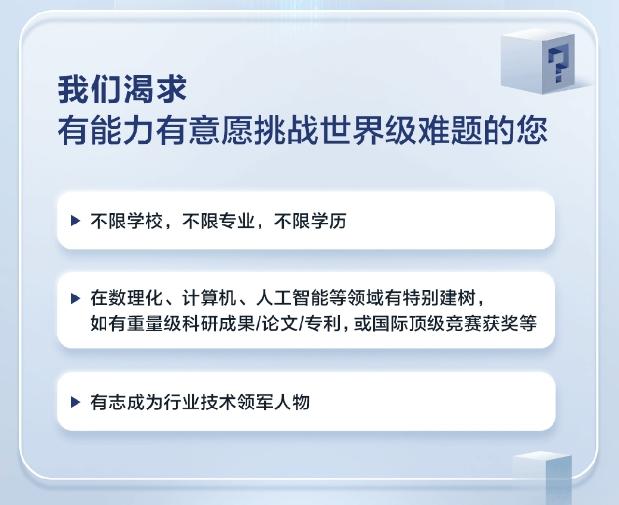 从发布的海报内容看,华为对天才少年不限学校、不限专业、不限学历,要求在数理化、计算机、人工智能等领域有特别建树,如有重量级科研成果/论文/专利,或国际顶级竞赛获奖等,并有志成为行业技术领军人物。