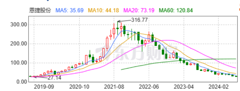 恩捷股份当前股价28.67元/股,股价最高点为2020年8月,316.77元/股。