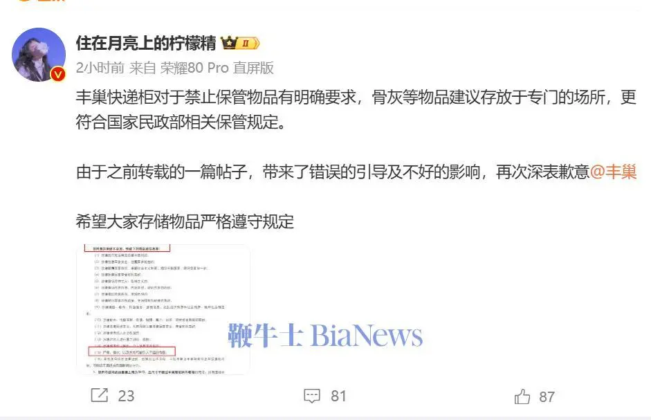 23日,该网友发博道歉称,“丰巢快递柜对于禁止保管物品有明确要求,骨灰等物品建议存放于专门的场所,更符合国家民政部相关保管规定。由于之前转载的一篇帖子,带来了错误的引导及不好的影响,再次深表歉意,希望大家存储物品严格遵守规定”。