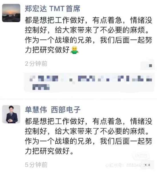 据新浪证券消息,7月23日消息,昨日西部证券研究所副所长郑宏达与电子首席单慧伟在工作群互撕出圈,引发热议。今日传出,二人已经和解。两位当事人深夜回应,甚至连文案都一致:作为一个战壕的兄弟,我们后面一起努力把研究做好……