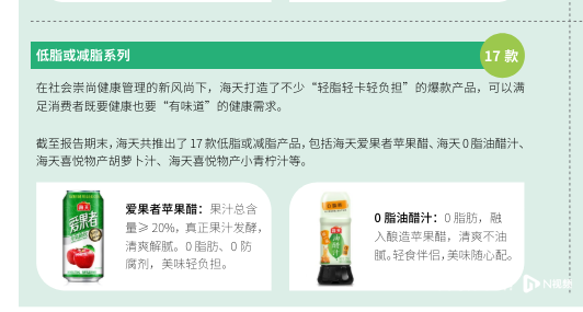 并且早在2021年时,海天味业就曾推出过苹果醋味和酱油味的雪糕,但彼时并没有进行大范围宣传。海天味业2022年ESG报告称,在社会崇尚健康管理的新风尚下,海天打造了不少“轻脂轻卡轻负担”的爆款产品,可以满足消费者既要健康也要“有味道”的健康需求。截至2022年报告期末,海天共推出了17款低脂或减脂产品,包括海天爱果者苹果醋、海天0脂油醋汁、海天喜悦物产胡萝卜汁、海天喜悦物产小青柠汁等。