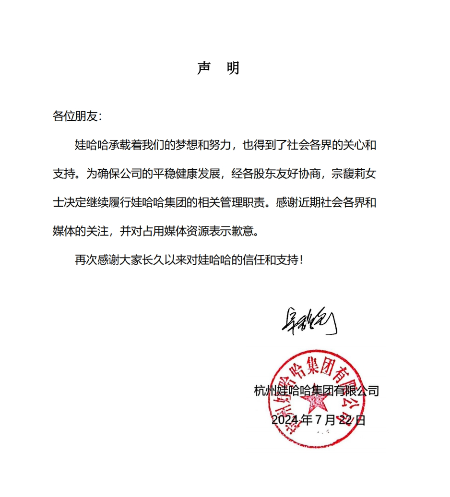 7月22日晚间,杭州娃哈哈集团有限公司发布声明:为确保公司的平稳健康发展,经各股东友好协商,宗馥莉女士决定继续履行娃哈哈集团的相关管理职责。