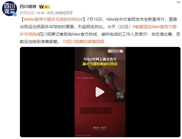 7月19日,Nike在中文官网发布全新宣传片,里面出现运动员舔乒乓球拍的画面,引起网友热议。22日,记者致电Nike官方热线,接听电话的工作人员表示:会反馈此事,目前没法给到准确答复。