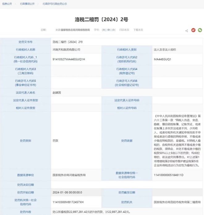 《中国经营报》记者在国家税务总局河南省税务局官网上查询到,这一消息源自2024年1月8日由国家税务总局洛阳市税务局第二稽查局(以下简称“洛阳市第二稽查局”)发布的一份行政处罚决定(决定文书号:洛税二稽罚﹝2024﹞2号)。