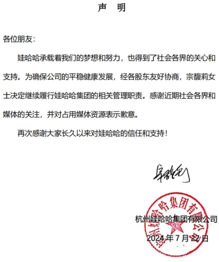 7月22日晚间,娃哈哈集团发布声明称,为确保公司的平稳健康发展,经各股东友好协商,宗馥莉女士决定继续履行娃哈哈集团的相关管理职责。娃哈哈还表示,感谢近期社会各界和媒体的关注,并对占用媒体资源表示歉意。