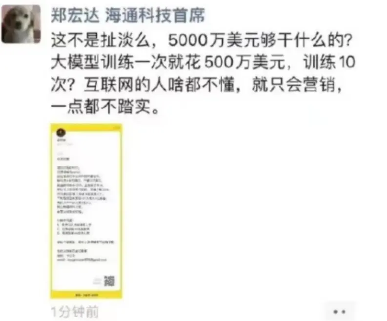事实上,郑宏达“怼人”出圈并非首次。2023年,原美团联合创始人王慧文在社交媒体“AI英雄榜”,称要组队拥抱新时代,打造中国OpenAI。紧接着,仍在海通证券就职的郑宏达在朋友圈开怼,质疑其带资入局AI是空想,发文表示“5000万美元够干什么的?大模型训练一次就花500万美元,训练10次?互联网的人啥都不懂,就只会营销,一点都不踏实。”