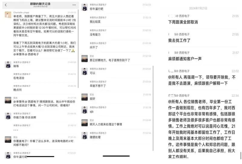 根据聊天记录,7月21日晚间21:45分,西部证券一位销售去联系单慧伟,麻烦他问某上市公司IR(投资者关系)能否提前半小时路演,单慧伟回复正在路演。郑宏达出面,表示该销售从中午就在催促此事,质问单慧伟“问一下公司时间,很难吗?”随后,单慧伟回应自己能力不足,无法完成这项任务。