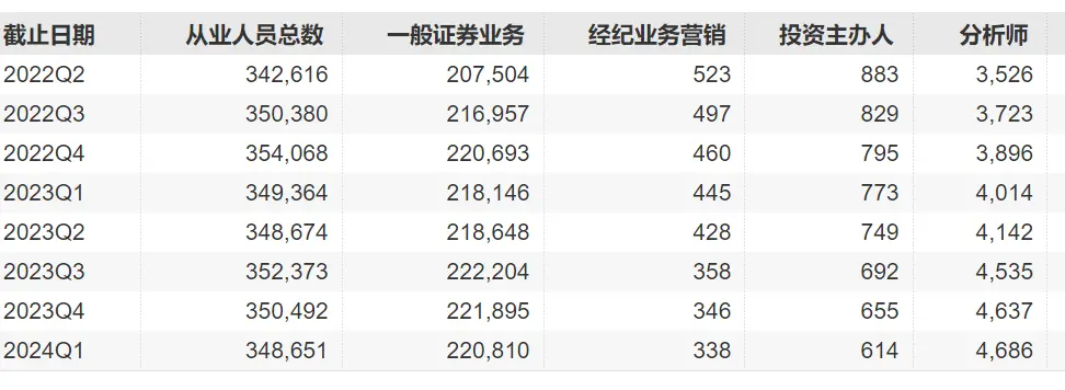 蛋糕小了,分蛋糕的却多了。Wind资讯统计数据显示,2024年一季度,分析师人数达到4686人,较两年前的2022年二季度增加了1160人。