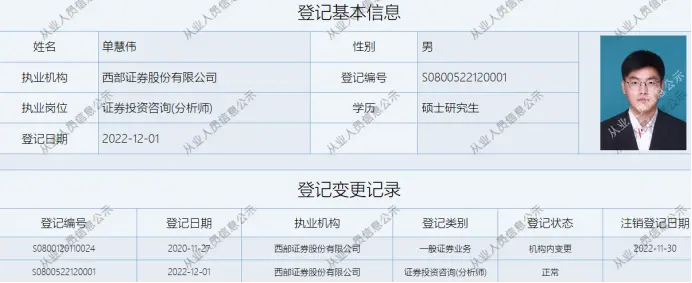 图为单慧伟执业信息,西部证券是单慧伟唯一卖方执业机构经历