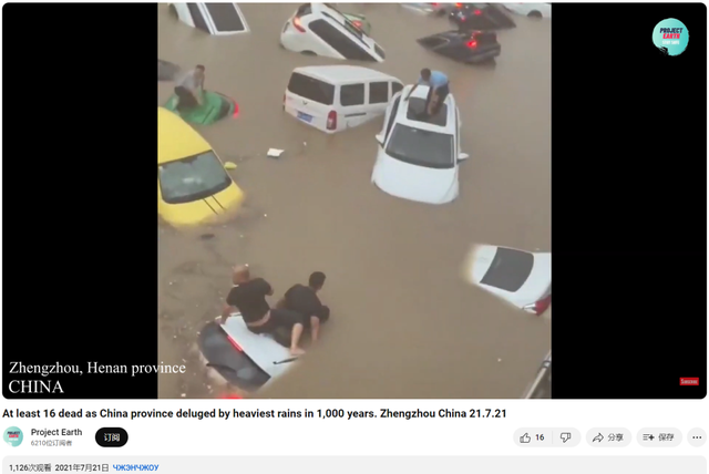 2021年7月21日,主要以发布如地震、洪水、龙卷风、海啸等自然灾害为主的“Project Earth”频道发布一则河南郑州遭遇极端暴雨的视频,其中32秒至1分01秒处包含网传视频片段。该频道已于同年9月停止更新。
