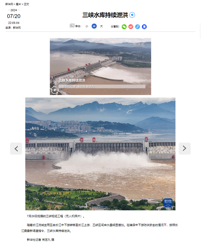 据新华社记者报道,随着长江流域主雨区由长江中下游转移至长江上游,三峡区间来水量明显增加。在确保中下游防洪安全的情况下,按照长江委最新调度指令,三峡水库持续泄洪。新华社发布的多张无人机照片显示,三峡大坝正常泄洪,没有发生垮塌事件。