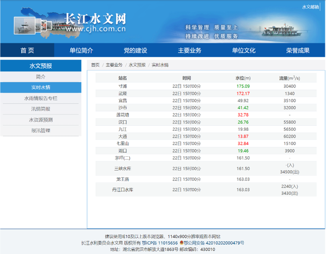 长江水文网发布的实时水情数据显示,截至7月22日15时00分,三峡水库的水位为161.5米,流量为34500m³/s。