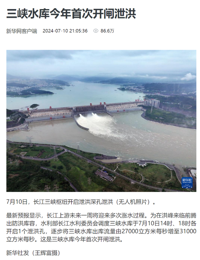 - 7月10日,三峡水库今年首次开闸,属正常防洪安全行为。新华社发布的多张无人机照片显示,三峡大坝正常泄洪,没有发生垮塌事件。
