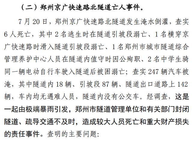 2022年1月,中国国务院灾害调查组发布的报告指出,调查认定,京广快速路北隧道发生淹水倒灌由极端暴雨引发。因郑州市隧道管理单位和有关部门封闭隧道、疏导交通不及时,共造成 6人死亡,247 辆汽车被淹,车内无遇难人员。