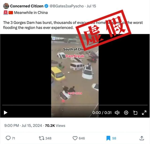 近日,X平台(原推特)上有传言称,中国的三峡大坝疑似尽数垮塌,造成了1975年以来最严重的洪灾。相关说法还附有一则时长约为30秒的视频,据称显示“三峡大坝决堤,造成数千个家庭被迫撤离”的场景。