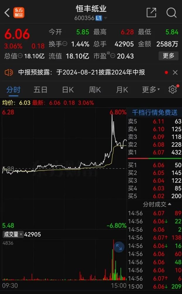 恒丰纸业是国内卷烟配套用纸研制与开发的领军型企业、国家烟草总公司确定的卷烟辅料生产基地。7月22日,公司尾盘出现明显上涨,收盘价为6.06元/股,总市值为18.10亿元。