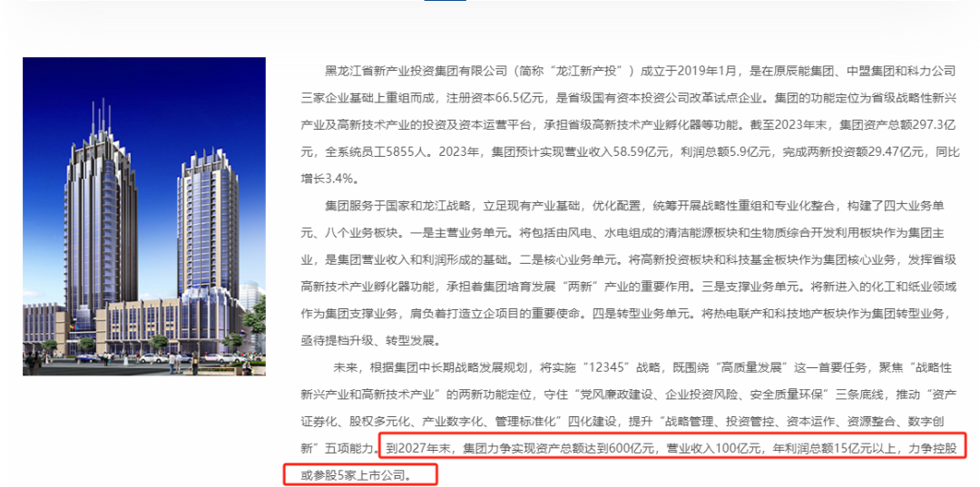 龙江新产投是省级国有资本投资公司改革试点企业,当前间接控制了A股上市公司恒丰纸业,已经计划到2027年末控股或参股5家上市公司。