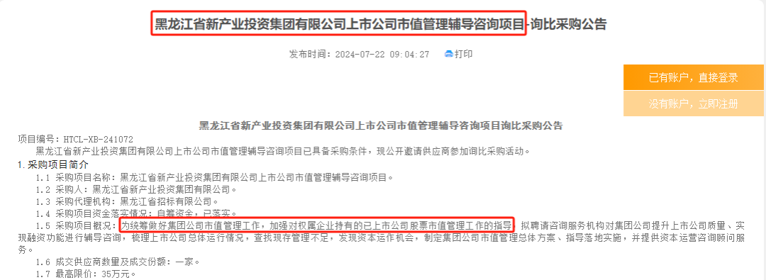 中招联合招标采购网显示,龙江新产投发布此次公告,是为了统筹做好市值管理工作,拟聘请咨询服务机构对其提升上市公司质量、实现融资功能进行辅导咨询。