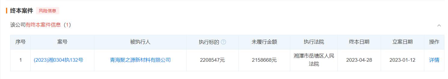 天眼查APP显示,青海聚之源自身风险多达148项,早在去年1月份就曾被潭市岳塘区人民法院列为限制高消费企业。此外,公司作为被执行人,包括未付丰元股份的7000余万元订金在内,合计被执行总金额高达1.33亿元。