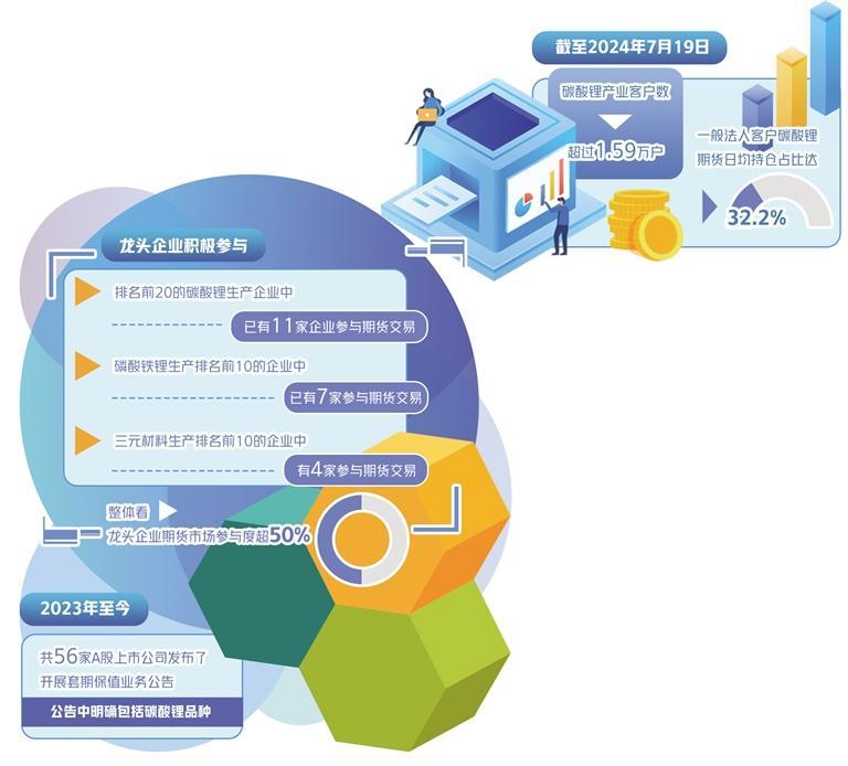截至2024年7月19日,碳酸锂产业客户数超过1.59万户,一般法人客户碳酸锂期货日均持仓占比达32.2%。龙头企业积极参与,排名前20的碳酸锂生产企业中已有11家企业参与期货交易;磷酸铁锂生产排名前10的企业中已有7家参与;三元材料生产排名前10的企业中有4家参与。从整体来看,龙头企业期货市场参与度超50%,产业客户数量及市场参与水平仍在稳步提升。